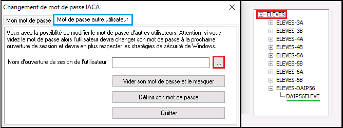 Pour changer le mot de passe d’un élève le professeur doit utiliser l’outil Changer son mot de passe depuis le menu démarrer Outils IACA.
