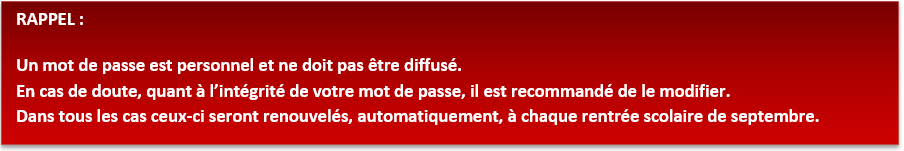 ![]() | A la première connexion les utilisateurs entrent leur identifiants de connexion. Le nom d’utilisateur est de la forme PNOM (première lettre du prénom suivi du nom) dans la limite de 20 caractères, sans apostrophe, sans espace, ni tiret. Exemple : Louise Le Grand-Dupont a comme nom d’utilisateur llegranddupont Remarque : S’il existe des homonymes alors il peut y avoir un chiffre à la fin du nom d’utilisateur. Le premier mot de passe est la date de naissance de l’utilisateur (de la forme JJMMAAAA). |