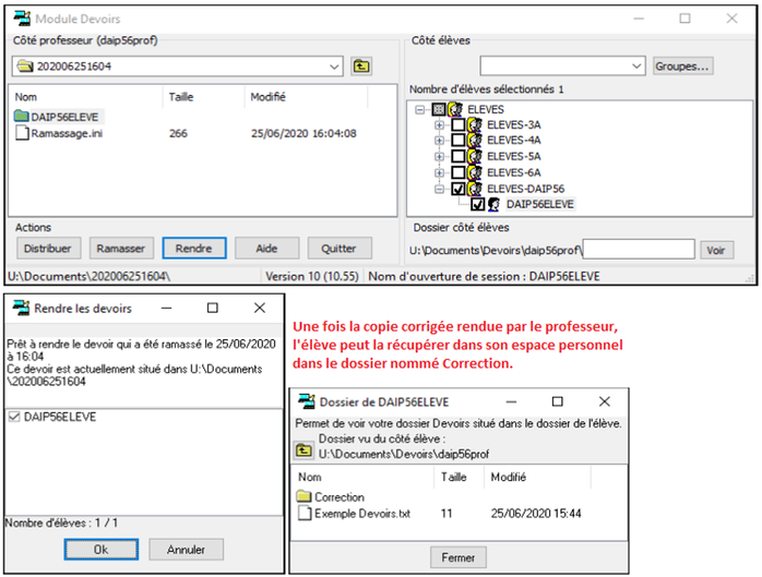 Enfin, après correction le professeur a la possibilité de rendre les copies corrigées aux élèves. Pour cela, il doit se positionner dans le dossier créé, lors du ramassage des copies. Ce dossier doit contenir un fichier Ramassage.ini