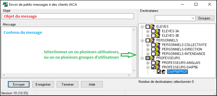 Tous les professeurs et tous les personnels ont la possibilité d’envoyer de simples messages IACA à tous les utilisateurs du réseau pédagogique via le module Messages. Il n’est pas nécessaire d’être connecté à une station pédagogique pour utiliser ce module.